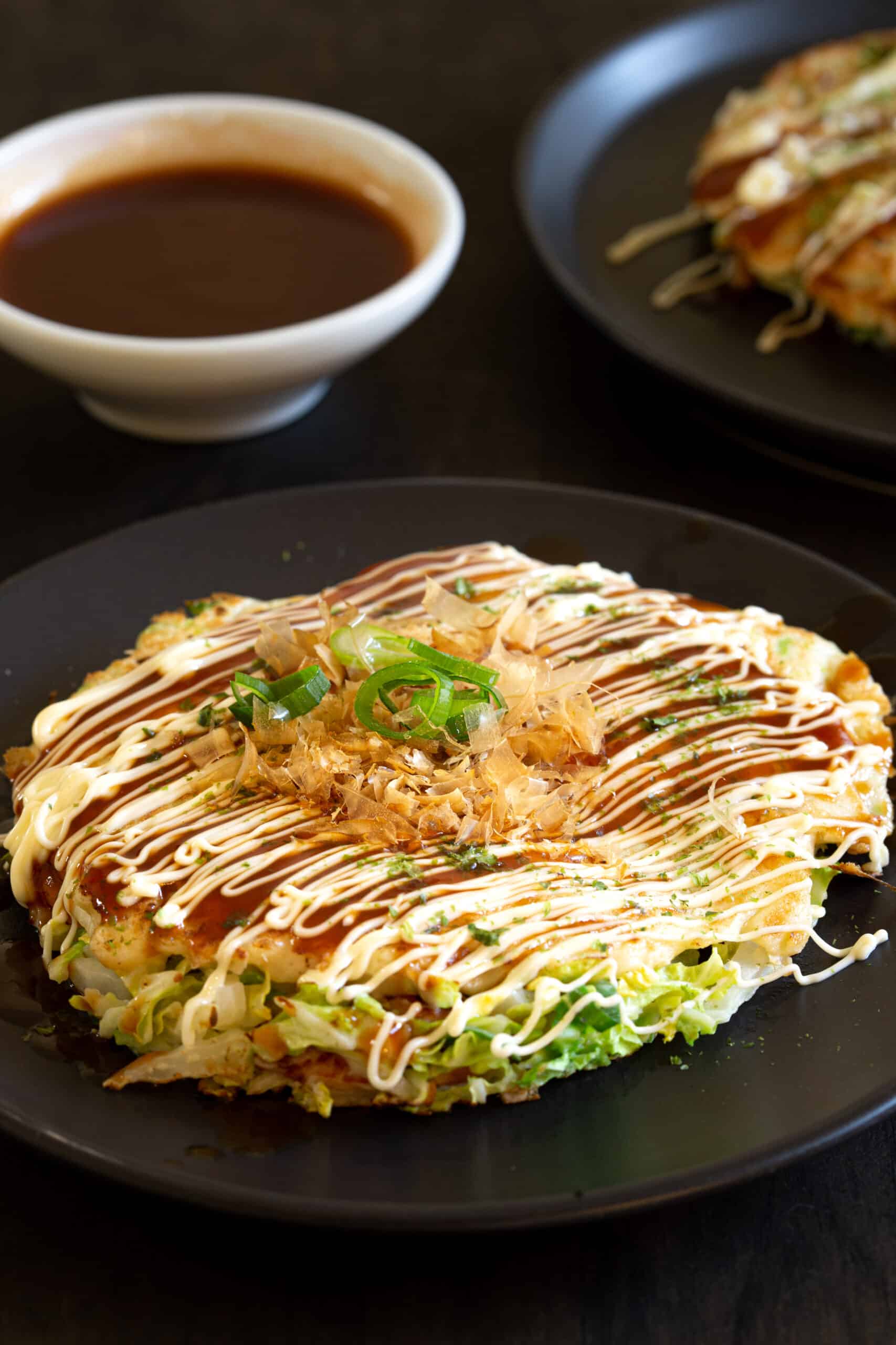 • Transfer your freshly cooked pancakes to serving plates, then top with drizzles of kewpie mayonnaise and okonomiyaki sauce. For even better tasting okonomiyaki, top with sprinklings of dried seaweed flakes, bonito flakes and a few slices of green onion to taste. You can also optionally top with the pickled ginger and Japanese 7 spice here.