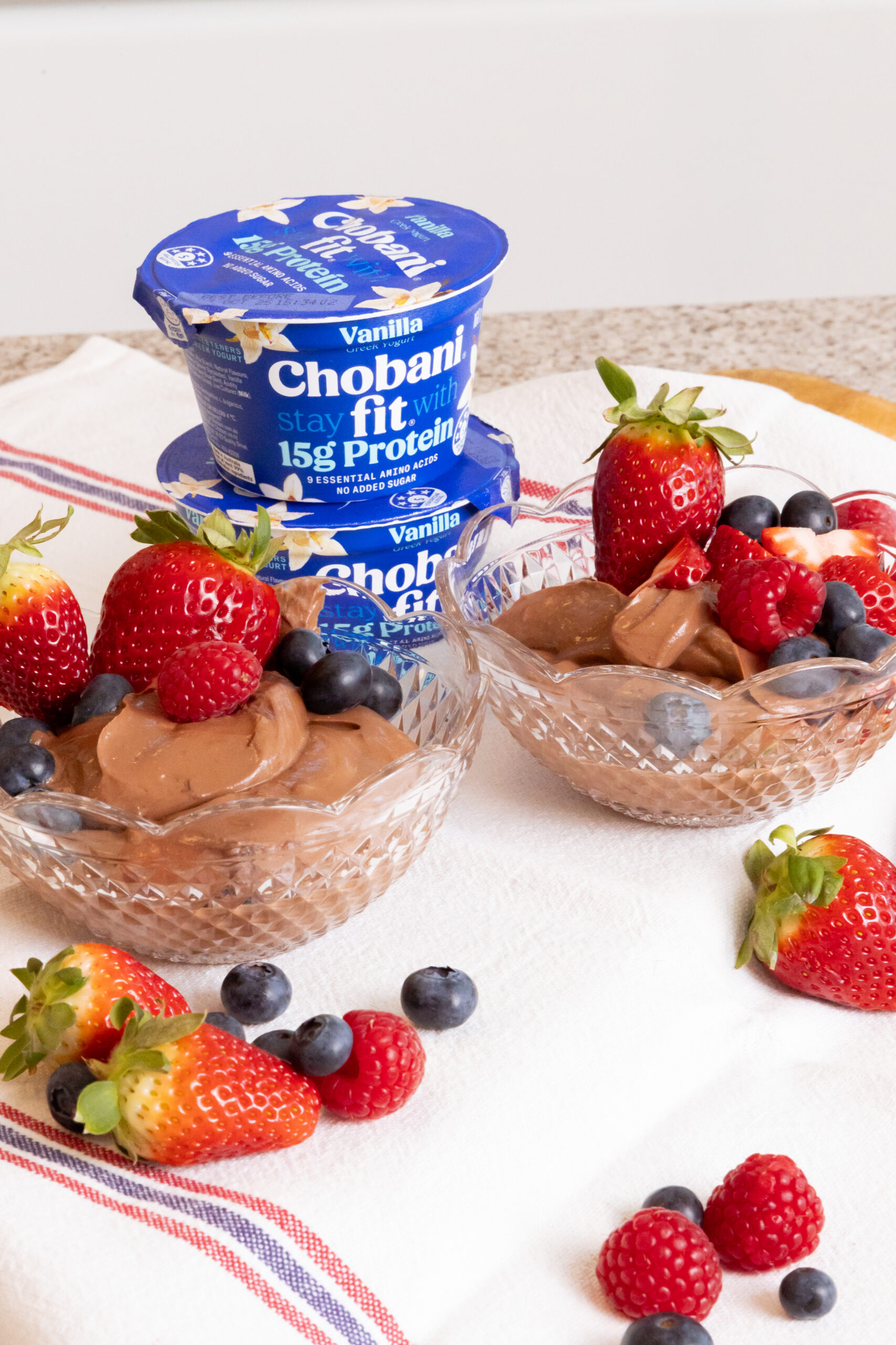 - Combine 160g Chobani fit Vanilla Yogurt, cacao powder, salt and melted chocolate with a hand mixer/food processor/blender. Just before you have finished, lightly mix in strawberries (be careful not to overmix).