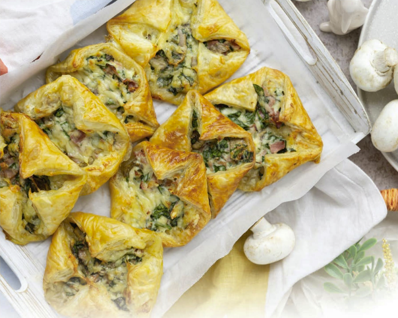Place a dollop of the mushroom mixture in the center of each pastry square Top with extra grated cheese. Carefully fold the tip of each square towards the center to partially enclose the filling.