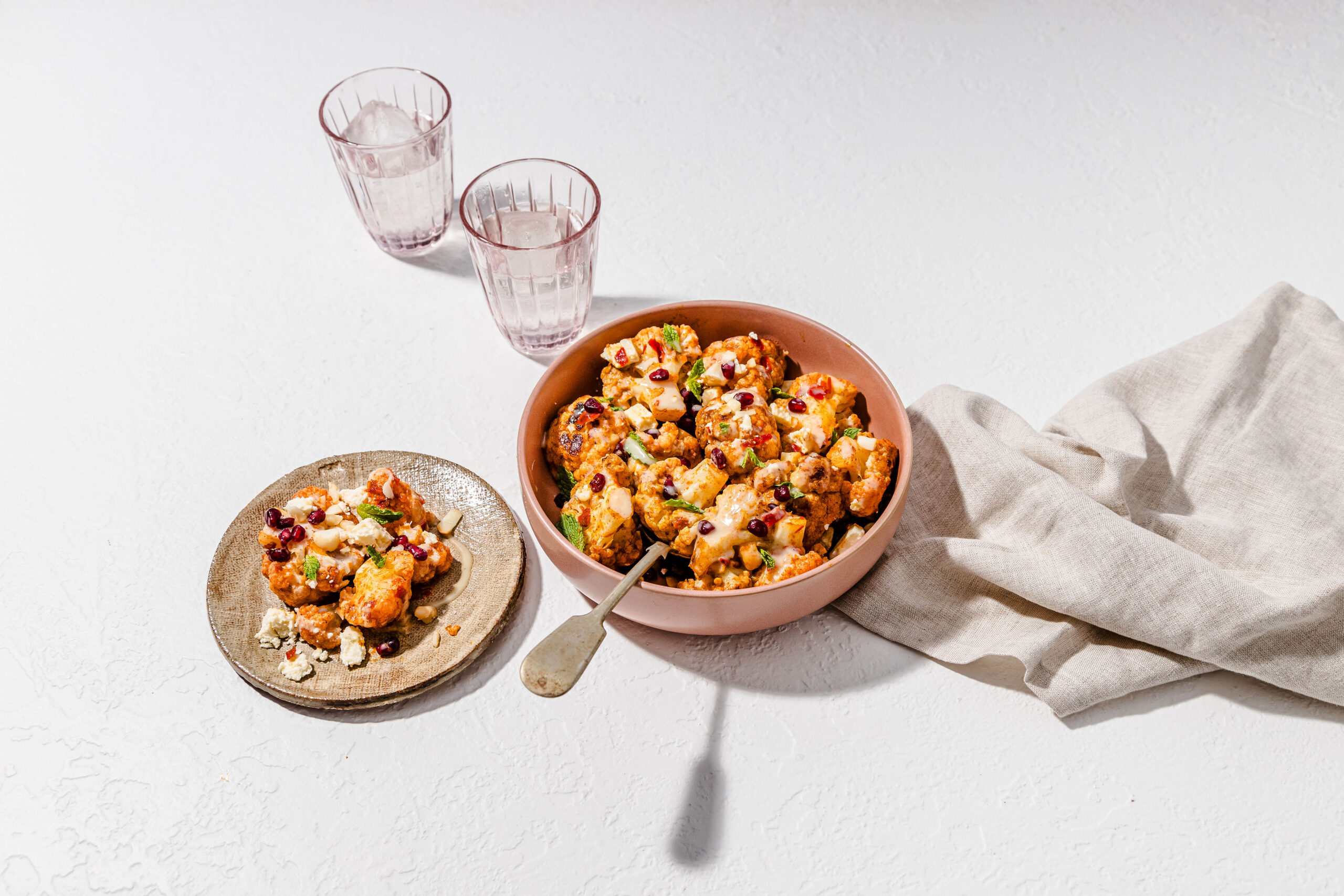 - To serve, top the cauliflower with the dressing, feta, pomegranate seeds, macadamia nuts and mint leaves.
