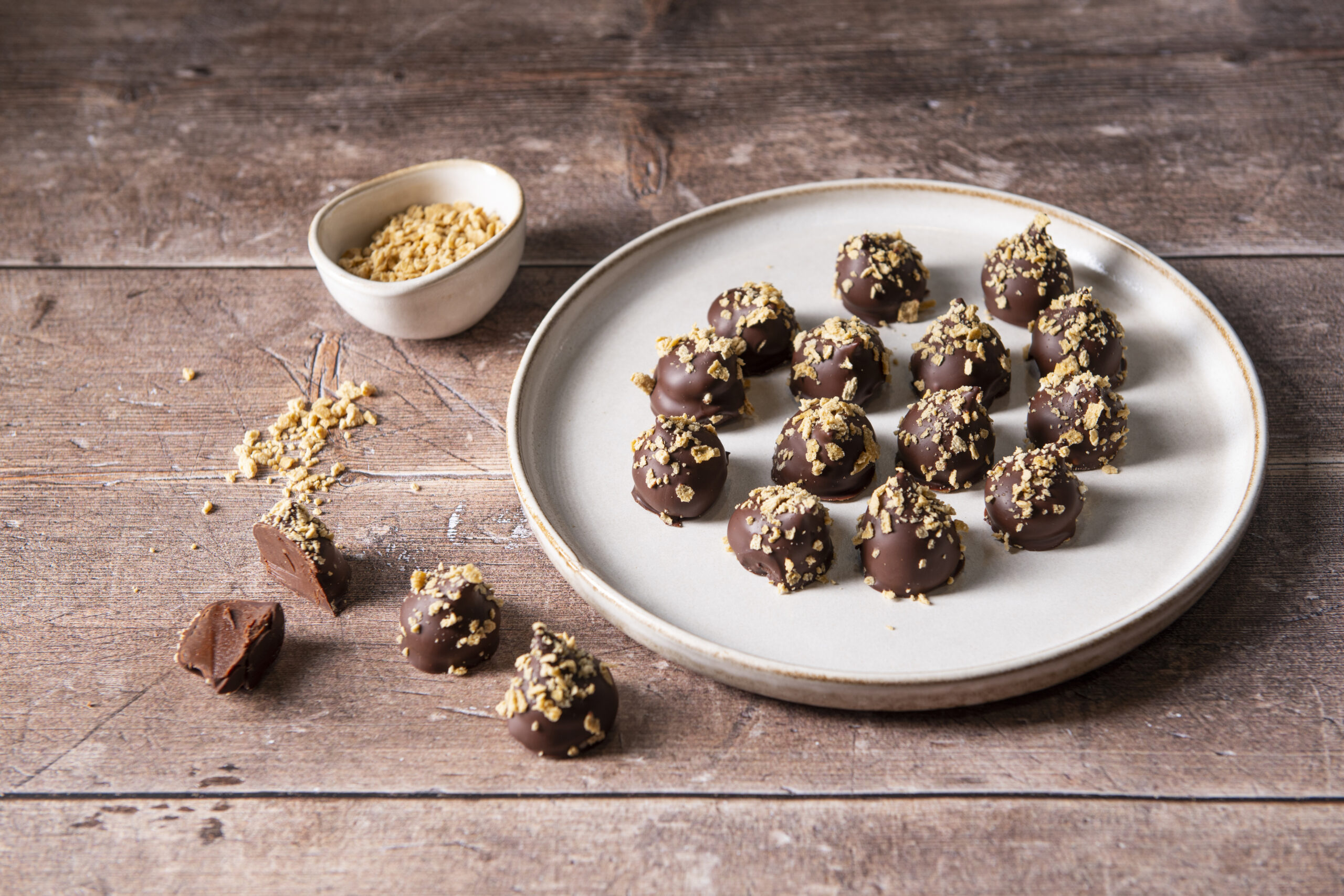 - Temper the separate dark chocolate, then dip each truffle into the chocolate, place on the clean tray and immediately sprinkle with maple flakes. Allow to set for 10-15 minutes and enjoy!